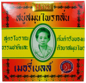 1949年創業の老舗「マダムヘン」ブランドは昔からタイ人の間で愛用されている石鹸で天然ハーブを独自の配合でブレンドし、パームヤシから取れる油に含まれるパルミチン酸を洗浄成分として使用し全て自然のものだけで作られています。私の使用しているマダムヘンのオリジナルタイプは生姜、ウコン、赤松の実、メントールなどが配合されていて、ハーブを使った効能はニキビ、吹き出物、発疹、肌のかさつき、シミ、体臭の抑制です。